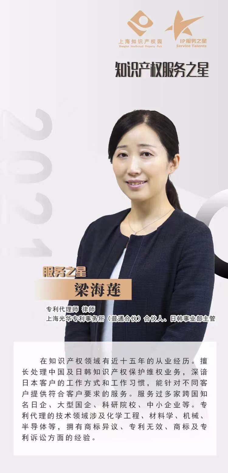 上海光華專利事務(wù)所合伙人,日韓事業(yè)部主管梁海蓮女士榮獲2021《上海知產(chǎn)觀察》編輯推薦獎知識產(chǎn)權(quán)服務(wù)之星。