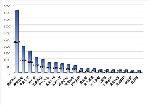 截至2月13日,上海科創(chuàng)板注冊(cè)生效77家企業(yè)中,從發(fā)明專利申請(qǐng)量排名來(lái)看,TOP20科創(chuàng)板企業(yè)發(fā)明專利申請(qǐng)數(shù)量均在180件以上,其中TOP3均在千件以上:聯(lián)影醫(yī)療以4627件占據(jù)首位,和輝光電以1951件屈居第二,中微公司位列第三(1616件)。