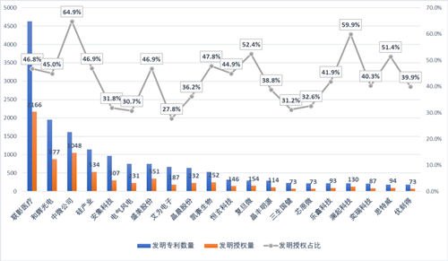 統(tǒng)計(jì)說(shuō)明:①本文專利授權(quán)占比的計(jì)算采用簡(jiǎn)單統(tǒng)計(jì)方式,即:統(tǒng)計(jì)時(shí)段內(nèi),當(dāng)前授權(quán)發(fā)明量/發(fā)明專利申請(qǐng)數(shù)量,其中發(fā)明專利數(shù)量也包含了“審中”、“屆滿失效”等法律狀態(tài)的數(shù)據(jù)。