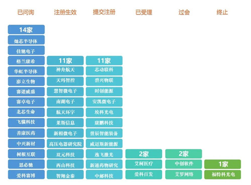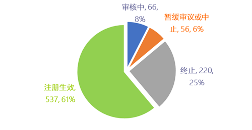 截止到2023年04月25日,科創板共計申報企業879家。其中注冊生效537家,終止(包括終止、終止注冊、不予注冊)220家,審核中(包括已受理、已問詢、上市委會議通過、提交注冊)66家,暫緩審議或中止56家。
