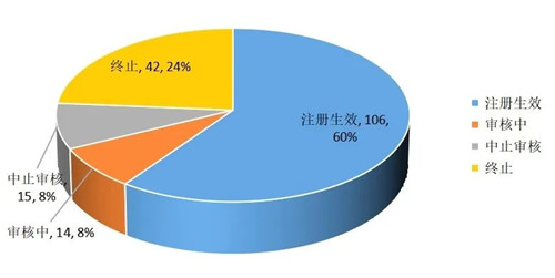 截至2023年4月20日,177家生物醫藥領域科創板申報企業中,注冊生效106家,終止(包括終止、終止注冊)42家,審核中(包括已問詢、上市委會議通過、提交注冊)14家,暫緩審議或中止審核15家。