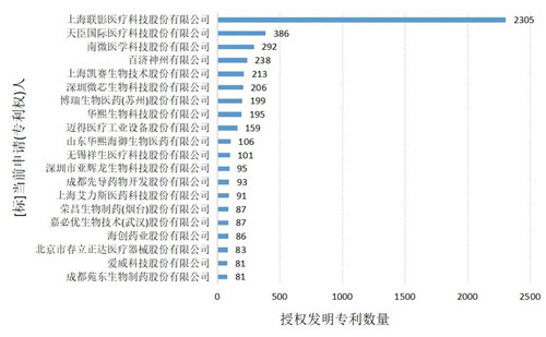 榜單顯示,聯影醫療、天臣國際、南微醫學、百濟神州、凱賽生物五家企業依次位居發明專利授權量排名榜前五。