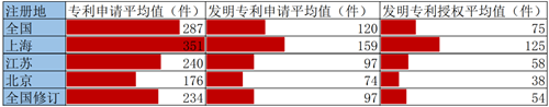 注冊地在北京的注冊生效的16家企業中,專利申請量平均每家176件,最具代表性的發明專利申請量平均每家74件,發明授權量平均每家38件。