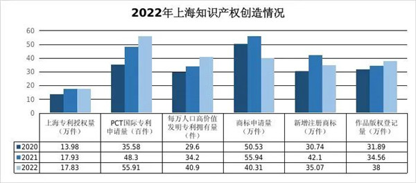 2022年,上海專利授權(quán)量17.83萬件,其中發(fā)明專利授權(quán)量3.68萬件,同比增長11.98%;PCT國際專利申請量為5591件,同比增長15.76%。截至年底,上海有效發(fā)明專利擁有量20.20萬件,同比增長17.43%;每萬人口高價值發(fā)明專利擁有量達到40.9件,較上年度增長6.7件。上海商標(biāo)申請量40.31萬件,新增商標(biāo)注冊量35.07萬件,截至年底,上海有效商標(biāo)注冊量達242.75萬件,同比增長14.66%。上海作品版權(quán)登記數(shù)突破38萬件,同比增長10%。上海共擁有地理標(biāo)志商標(biāo)18件,地理標(biāo)志產(chǎn)品8個。上海獲得農(nóng)業(yè)植物新品種授權(quán)31項,林業(yè)植物新品種授權(quán)9項。上海在世界知識產(chǎn)權(quán)組織(WIPO)發(fā)布的《全球創(chuàng)新指數(shù)報告》“最佳科技集群”中的排名由2021年第8位上升至第6位(與蘇州合并為同一科技集群)。