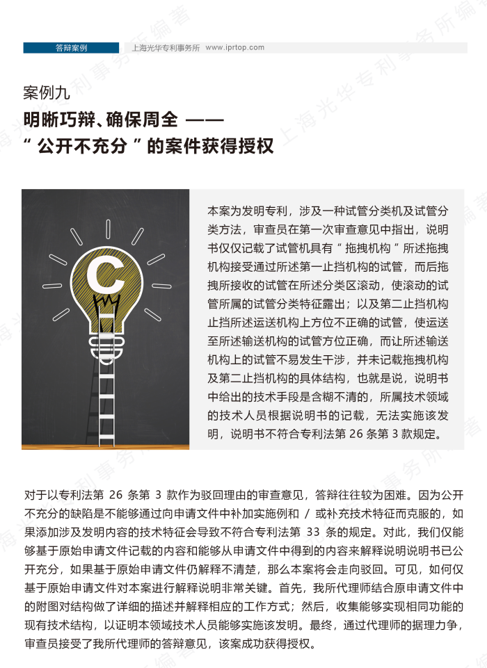 案例九涉及一種試管分類機(jī)及試管分類方法,案例難點(diǎn)在于如何僅基于原始申請(qǐng)文件對(duì)本案進(jìn)行解釋說明。首先,我所代理師結(jié)合原申請(qǐng)文件中的附圖對(duì)結(jié)構(gòu)做了詳細(xì)的描述并解釋相應(yīng)的工作方式;然后,收集能夠?qū)崿F(xiàn)相同功能的現(xiàn)有技術(shù)結(jié)構(gòu),以證明本領(lǐng)域技術(shù)人員能夠?qū)嵤┰摪l(fā)明。最終,通過代理師的據(jù)理力爭(zhēng),審查員接受了我所代理師的答辯意見,該案成功獲得授權(quán)。
