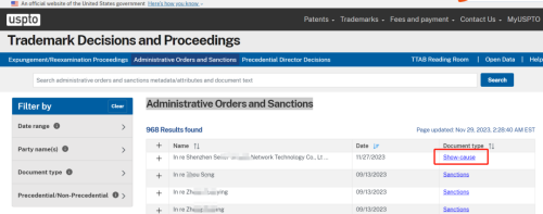 近期,2023年11月27日,USTPO再次發布了“Supplemental Show Cause Order”(補充舉證指令),延續了上次的調查。USTPO搜集了更多證據,本次涉及53,205個商標,文件多達1319頁。此次懲戒,美國商標局還專門列出了這些商標代理公司的中文名稱。文件鏈接如下:https://developer.uspto.gov/tm-decisions/search/administrative