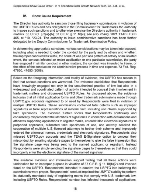 繼去年9月,美國商標局針對深圳某公司發出了“Order to Show Cause”(陳述理由指令),長達600多頁的文件詳細描述了商標注冊違規行為。事件涉及13,000多個商標被撤銷。