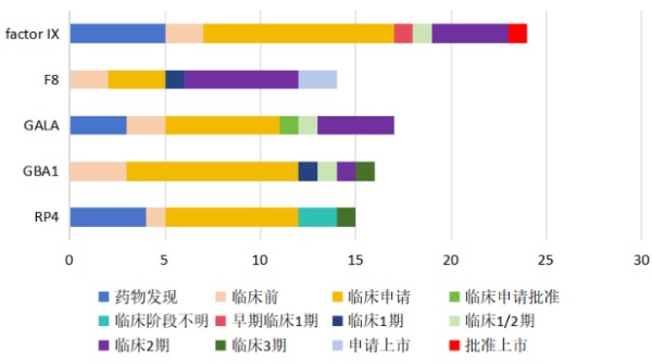 進一步對AAV基因治療藥物相關靶點進行分析。在研藥物針對的排名前5名的抗原靶點依次為Factor IX、F8、GALA、GBA1以及RP4。Factor IX是AAV基因治療藥物研究最火熱的靶點。