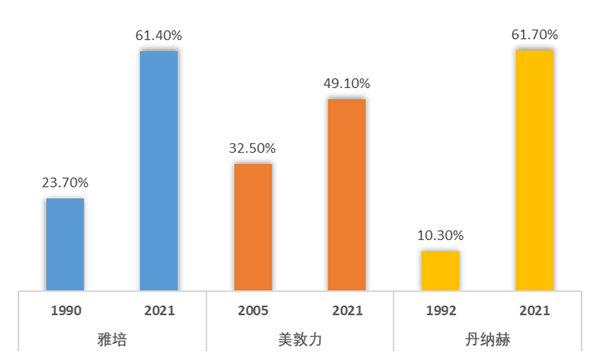 90年代以來,海外醫(yī)療器械龍頭國際化水平整體呈現(xiàn)逐年提升的態(tài)勢(shì),尤其是龍頭企業(yè)。下圖為雅培、美敦力、丹納赫近年來國際化水平變化數(shù)據(jù),海外營收是這些企業(yè)打開成長空間的關(guān)鍵所在,企業(yè)借助國際化布局升級(jí)為全球醫(yī)療器械龍頭。