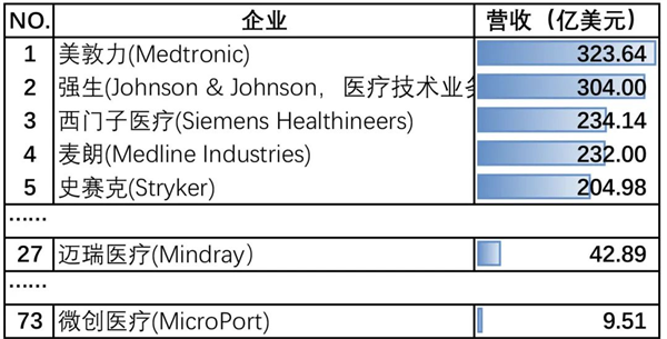 Medical Design & Outsourcing發(fā)布2024年全球醫(yī)療器械百強(qiáng)榜單,美敦力、強(qiáng)生、西門子蟬聯(lián)營收前三,營業(yè)收入分別為323.64億美元、304.00億美元、234.14億美元。中國醫(yī)療器械企業(yè)共有兩家入選,分別是邁瑞醫(yī)療(42.89億美元)和微創(chuàng)醫(yī)療(9.51億美元),對(duì)比中國企業(yè)和榜首的營收數(shù)據(jù),不難發(fā)現(xiàn),即使是中國龍頭企業(yè),與榜首的營收差距也十分明顯。