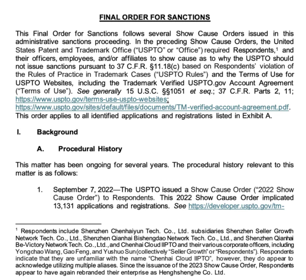 美國專利商標局對一家外國申請公司(中國深圳SG及其關聯公司)實施制裁,終止 52,000 余件與該公司相關聯的涉嫌欺詐取得或維持的商標申請及注冊。